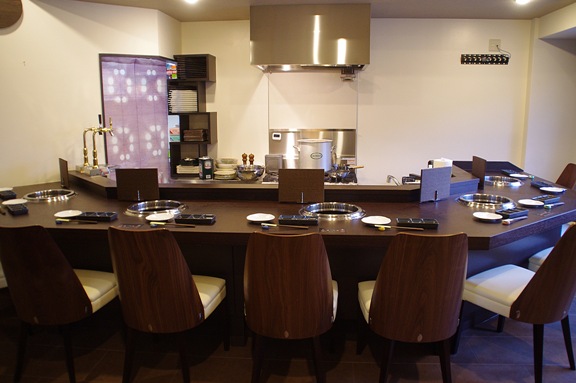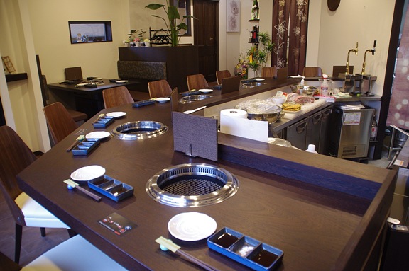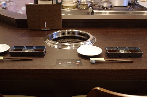 ウエンジの重厚な質感。無煙ロースターのスイッチは二人掛け席の真ん中に配置。