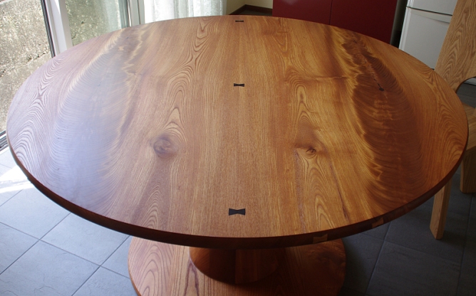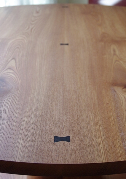 真ん中接ぎ目の3つの黒檀(コクタン)材の契り(蝶々型の埋め木)がアクセントになります。