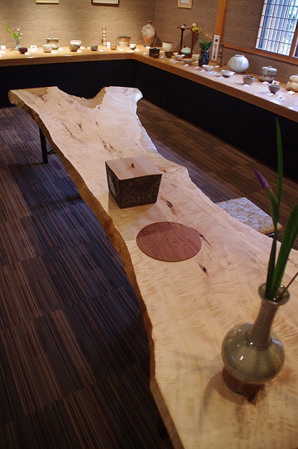 ご亭主の席。丸く炉を切っています。蓋はタブ材の縮み板を使用。