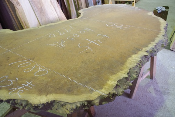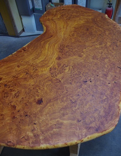 瘤(コブ、バール)ですから木目も面白いですね(工房にて撮影)。