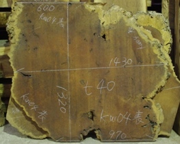 周辺部分の白太を極力残しながら大きくボーズ面をとりました。自然の板の形そのままです。