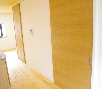 建具も弊社デザイン・製作。板目のナラ突き板を横向けに並べました。