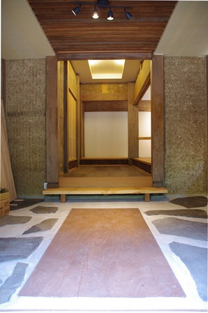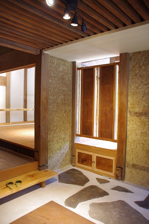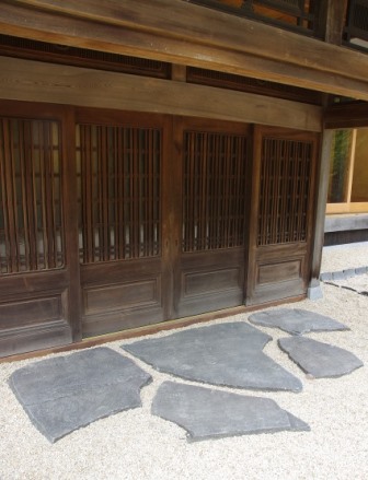 入口には大きな踏み石を。 建具は既存のものを流用。