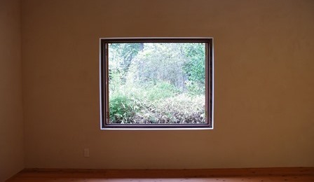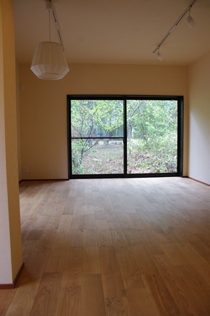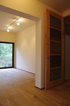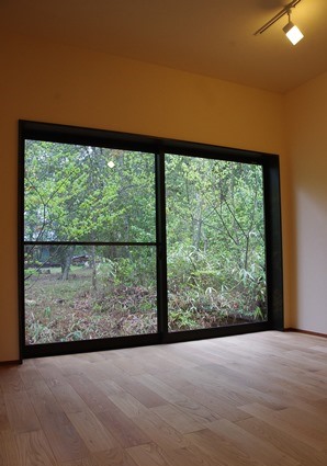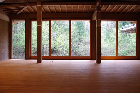 大きなガラス戸が南向きで明るさを取り入れ大自然と一体になれます。 (このサイズの木製ガラス戸は弊社史上最大の高さ2700mm)。