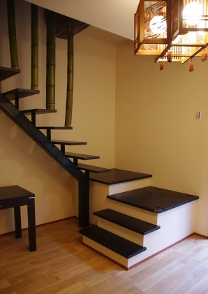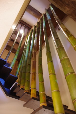 階段の落下止めには庭に生えていた竹を用いました。 (竹林みたいです)