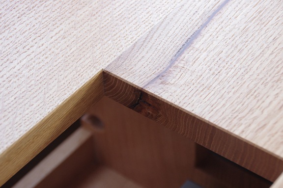 側板と天板は45度のトメで木目がつながっているかのような仕口。側板の虎斑(とらふ)が大変美しいです。
