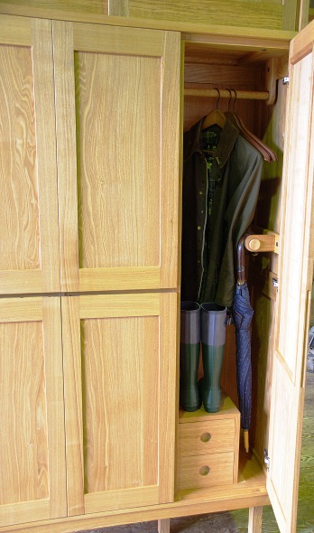 鏡の建具部が新機能の上着掛け兼趣味道具収納抽斗(引き出し)と傘立て。 ハンガー吊りと傘立て部は取り外し式。