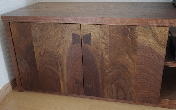 開き戸は縦に木目を配した3枚接ぎのデザイン。2枚の境目には同じウォルナットの象嵌で引き締めています。