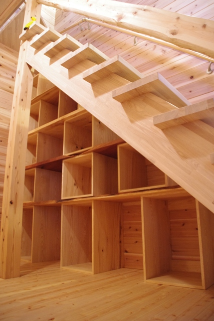 ボックス方式なので棚幅は自在に変更可能。棚板と階段の踏板は高さが同じになるようになっています。