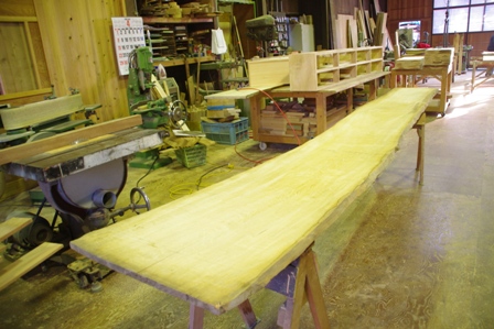 天板を用意、ではなく、これが前板。4000mmの一枚板。 天板は後ろの方に見えています。同じく4000mmもの。
