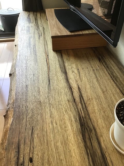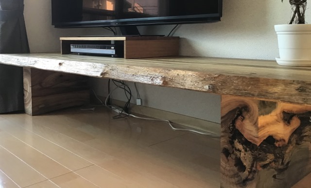 シンプルデザインのTV台はアサメラ材で製作。シックなリンバの天板に同じアフリカ材で。