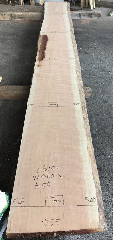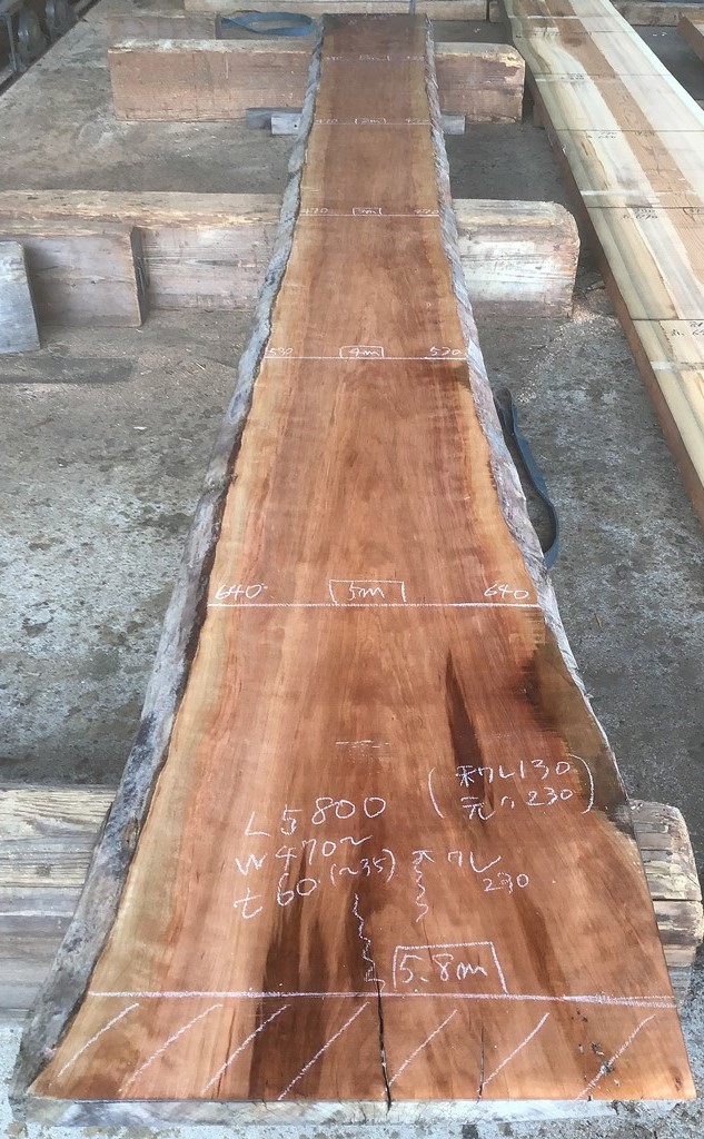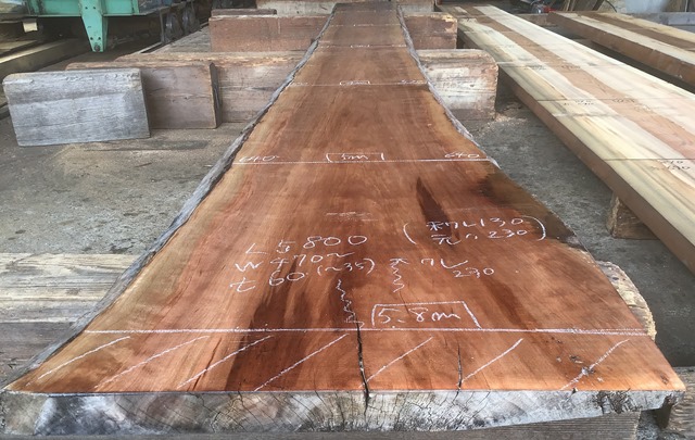 状 態:荒木 / 特 徴:実際の長さは5800mmですが木口に割れがあるので5400mm使いが妥当。 両耳落としを推奨。残すとしても左耳。 全体に汚れていますが削ればきれいです。 / 幅:末550mm ・中470mm ・元640mm / 長期乾燥済み