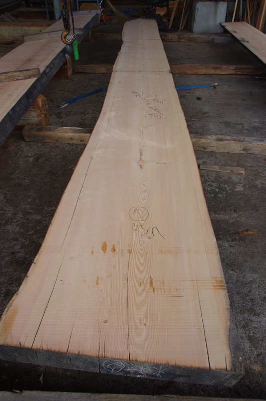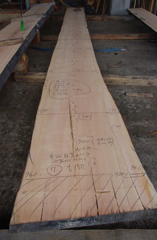 状 態:荒木 / 特 徴:節あり板。多少割れもありますが表から50mmほど落とすと根元近くの大きい割れ以外はある程度きれいに落ちそうです。 厚みを二枚割するなど使い方は何通りかあります。写真に付属する説明文をお読みください。 長さ7000〜7500mm程度、幅耳なし550mm前後向けのお値打ち格安商品。片耳付き幅600mm行けそうです。 加工も別途ご相談ください。 / 幅:末670mm ・元960mm / 9年以上天然乾燥保管
