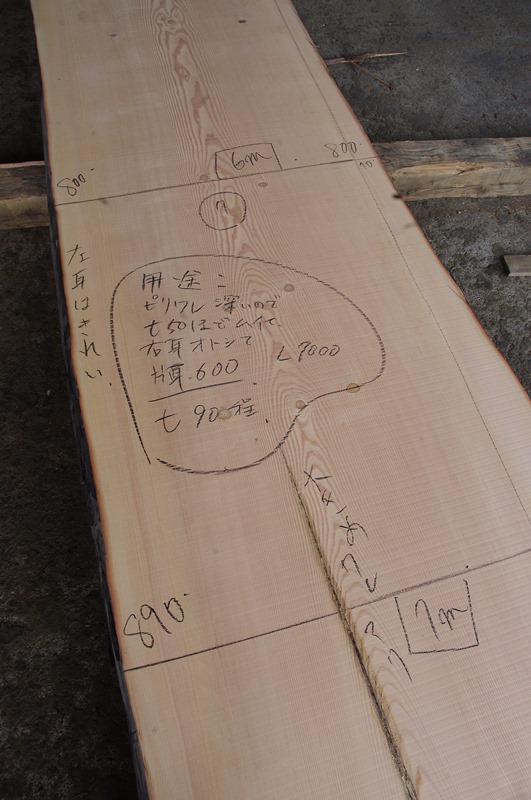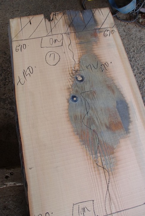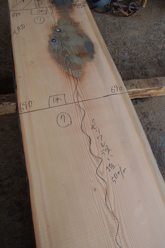 末から2000~3000mm部の右耳が痛んでささくれています。 幅80mmほど落として片耳使いの板にしなければいけません。