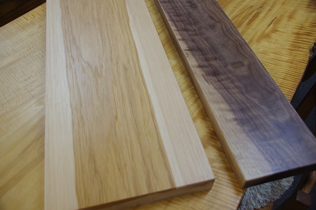 ヒッコリーの仕上がり見本(左)2016年7月製作。独特の明るい色です。右のウォルナットとお比べください。 共にクリアウレタンツヤ無し塗装です。事務所にありますのでご覧にお越しください。