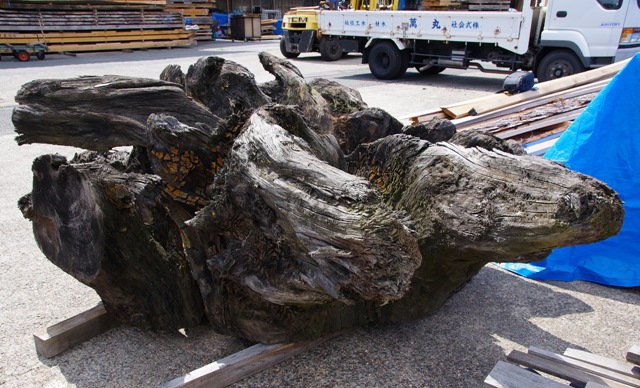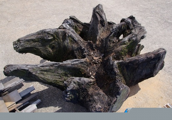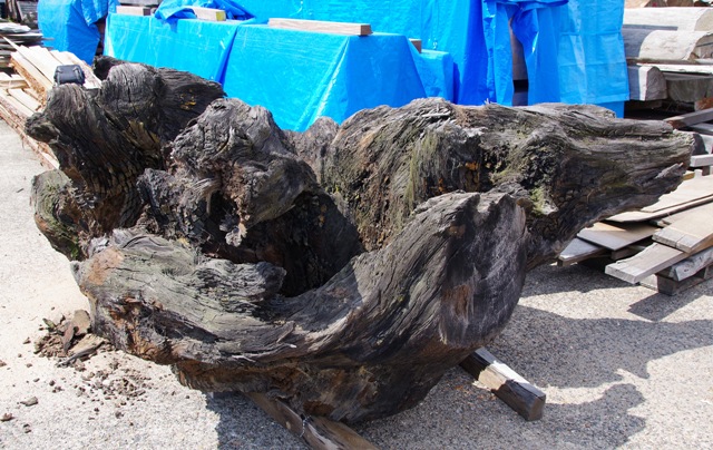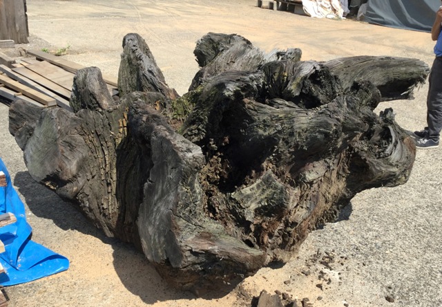 状 態:荒材 / 特 徴:写真は根っこの底を上に向けた状態です。 長期雨ざらしで黒くなっています。しかし神代ケヤキですからもともとの色もついているはずです。 オブジェはもとより、ガラスを乗せて巨大テーブルに適したサイズで存在感発揮。 さらなる加工は困難を極めると思います。できるだけこのままでの使用をお勧めします。 / 直径:2600mm~2300mm / 長期乾燥済み。しかし完全とはいかないとみています