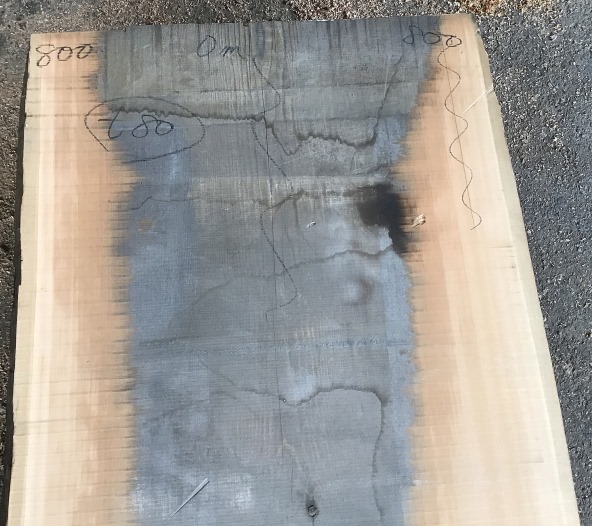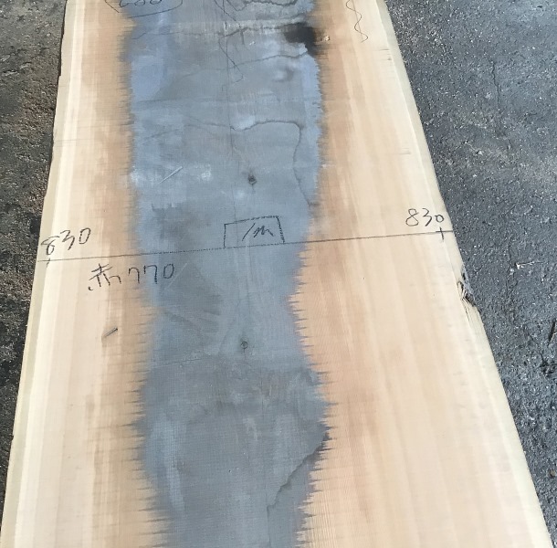 1000mm付近。汚れているところは薄いところです。全体を少し削れば均等な色と厚みになります。 このあたりもぴり割れがあります。