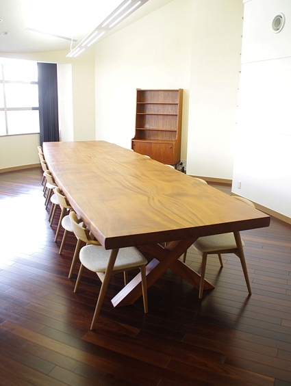 天板下には脚しかないので椅子の出し入れやひざ上の自由度が高いタイプ。板の反りへの対応は反り止めを入れることが多くなります。脚4本の太さは天板の厚みとバランスをとったサイズ(厚み60mmではおおよそ70mm×60mm)。