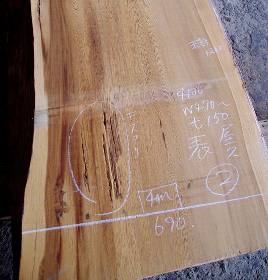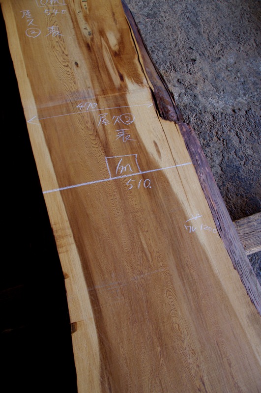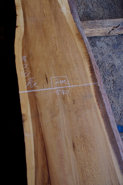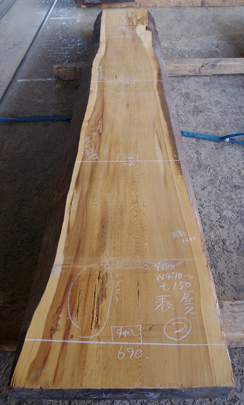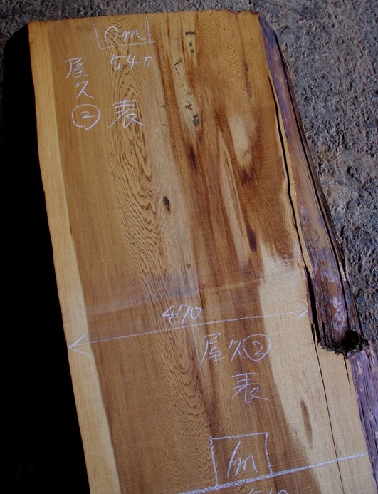 状 態:荒材 / 特 徴:長尺ものの屋久杉小杉。木目はワイルドというよりむしろ繊細で上品。それゆえ現代の女性らしい線の細いデザインにも適合しえる一品です。